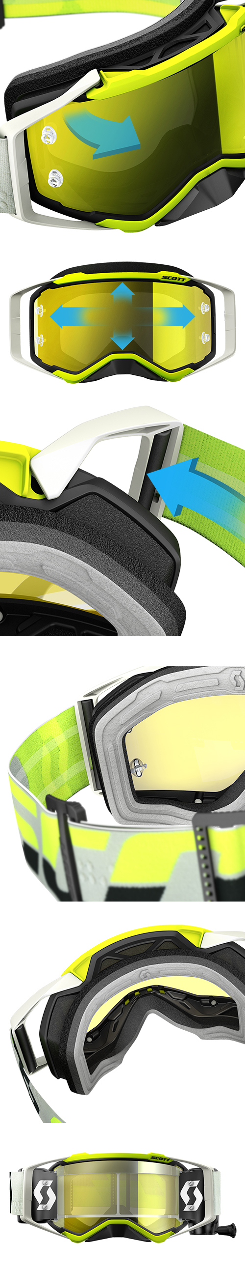 Prospect er et nytt høydepunkt blant MX-briller og det har aldri vært noe lignende på markedet før. Det gir føreren et maksimalt synsfelt på grunn av den ekstra høyden på linsen. I tillegg har det en innovativ SCOTT lens-lock system som gjør at linsen sitter i rammen uansett hvilken innvirkning som kommer fra utsiden. For å sitte godt på hjelmen er den utstyrt med en ekstra bred, no-slip silikon stropp. Denne stroppen sammen med utriggerne bidrar til god integrering på hjelmen. Sist men ikke minst, Prospect kommer med to linser; krom og klart - perfekt for alle værforhold.